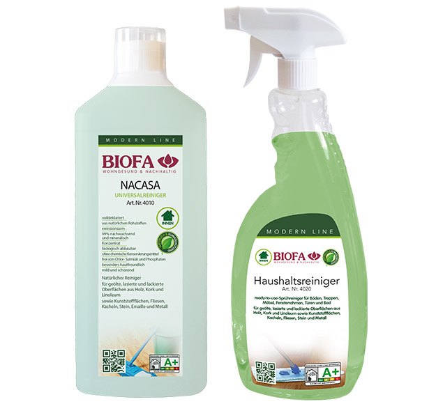 Für die Reinigung mit NACASA Universalreiniger 10 ml auf 1 Liter Wischwasser geben. Nicht überdosieren, sonst kann Streifenbildung auftreten. Für die feuchte Reinigung von mit BIOFA Produkten behandelte Oberflächen hat sich ein Druckpumpzerstäuber bewährt. Hiermit das verdünnte NACASA einfach auf den Boden oder einen Mopp oder Lappen auftragen und die Oberfläche aufwischen.