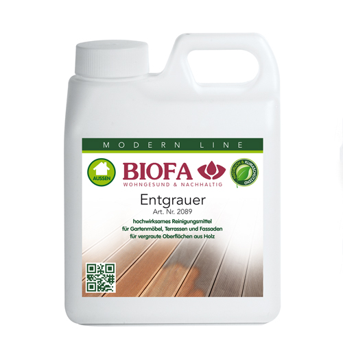 BIOFA Entgrauer ist ein intensives Reinigungsmittel für alle vergrauten, behandelten und unbehandelten Hart- und Weichholzoberflächen. Er reinigt, frischt und hellt vergrautes Holz wieder auf und gibt ihm so seine ursprüngliche Farbe und damit seinen natürlichen, schönen Charakter zurück. Die Maserung des Holzes wird wieder deutlich hervorgehoben. Besonders zu empfehlen für Terrassen, Gartenmöbel, Holzdecks, Holzfassaden und ähnliche Flächen im Außenbereich. Durch seine gelartige Konsistenz bleibt er auch auf schrägen und senkrechten Flächen gut stehen.